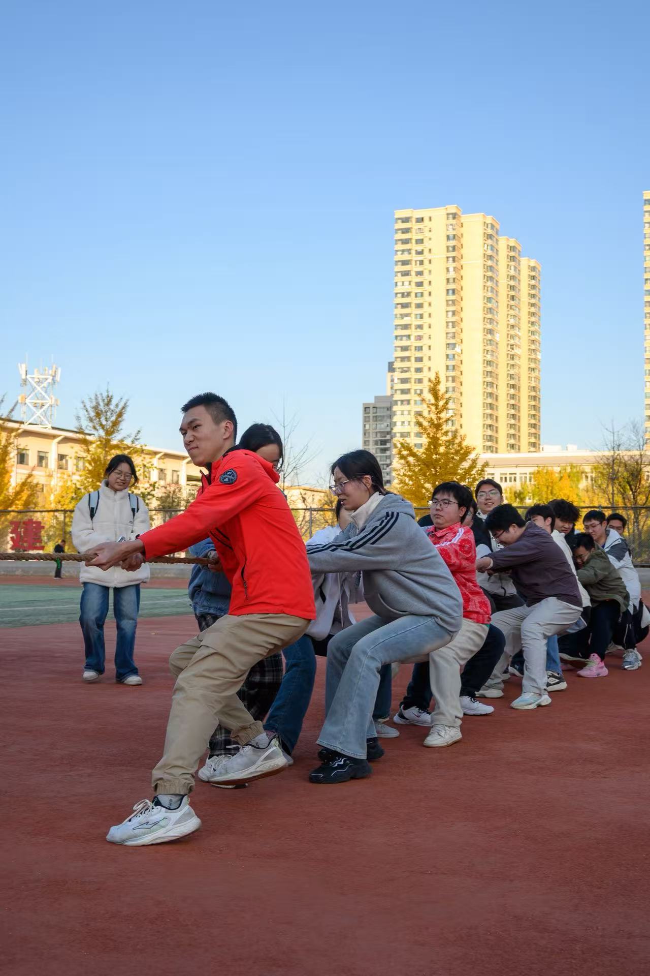 比赛期间,各班级队员热情高涨,赛前相互鼓劲磨合战术,哨声响起便齐心协力、奋力后拉,通红的脸颊与紧绷的臂膀尽显韧劲;场边师生的加油声此起彼伏,成为队员们咬牙坚持的最强后盾。裁判组严谨执裁,保障了每一场比拼的公平有序。